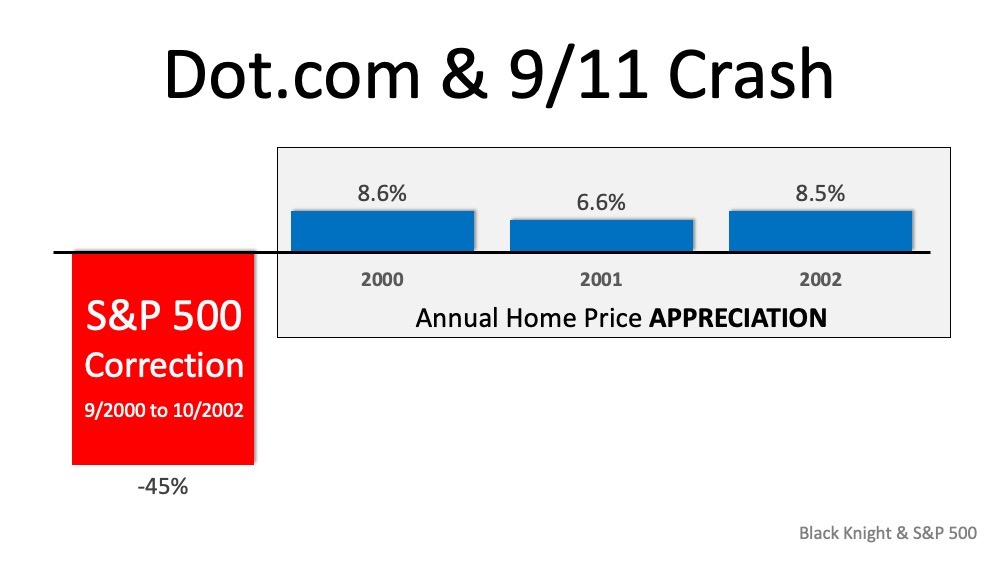 Since the current situation resembles the stock market correction in the early 2000s, let’s review what happened to home values during that time. The S&P dropped 45% between September 2000 and October 2002. Home prices, on the other hand, appreciated nicely at the same time. That stock market correction proved not to have any negative impact on home values.